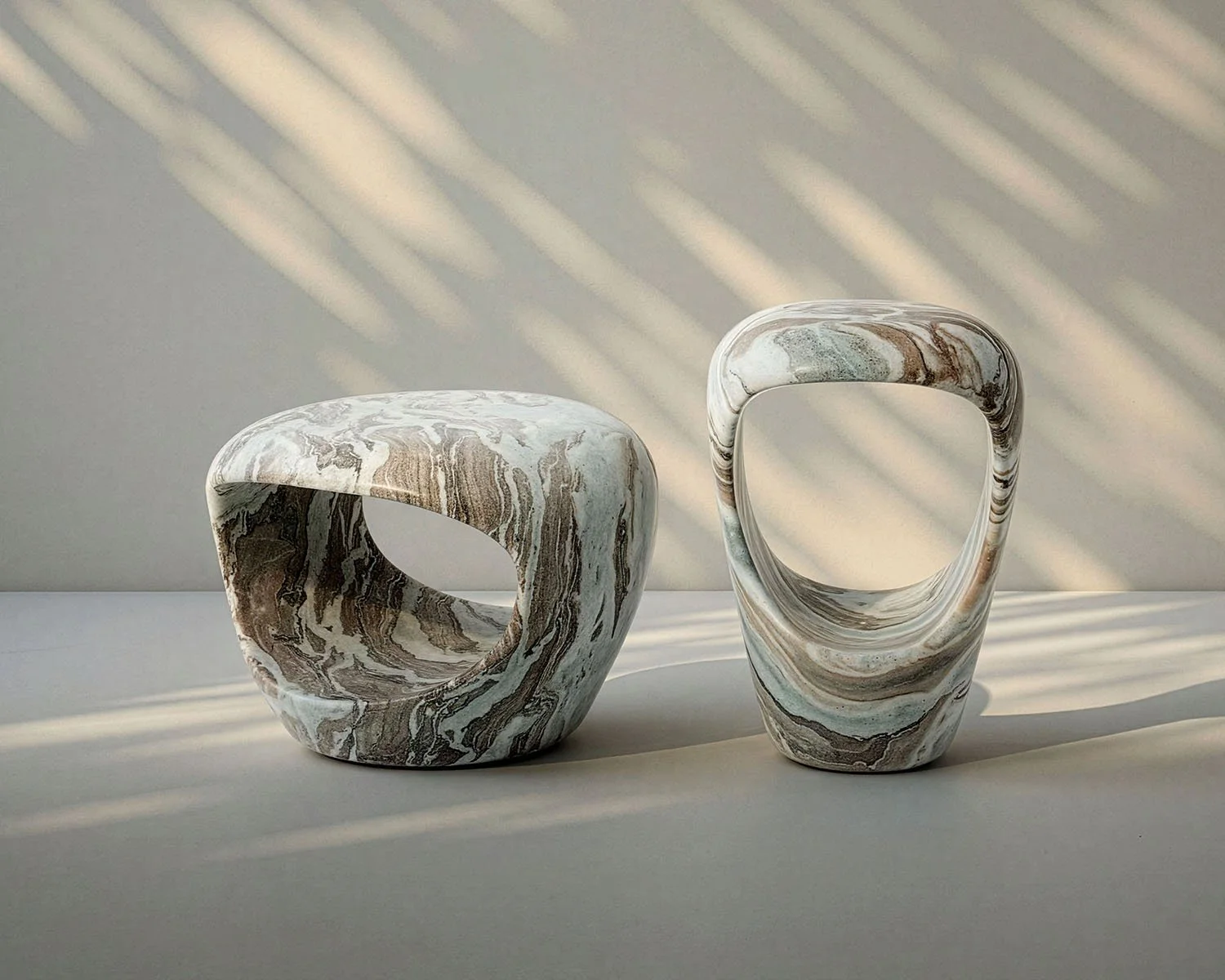 Introducing our new Waterfall Tables, hand-carved from a single block of marble to create a beautiful interplay of positive and negative spaces. Shown in Honed White Indian Satvario Marble and accompanying our Daybreak Lounge Chair.