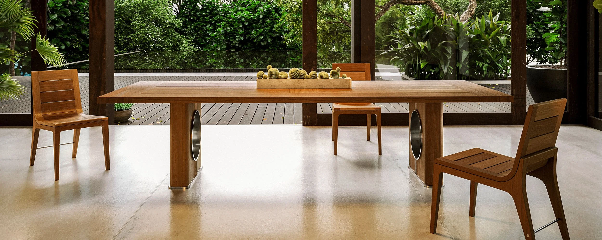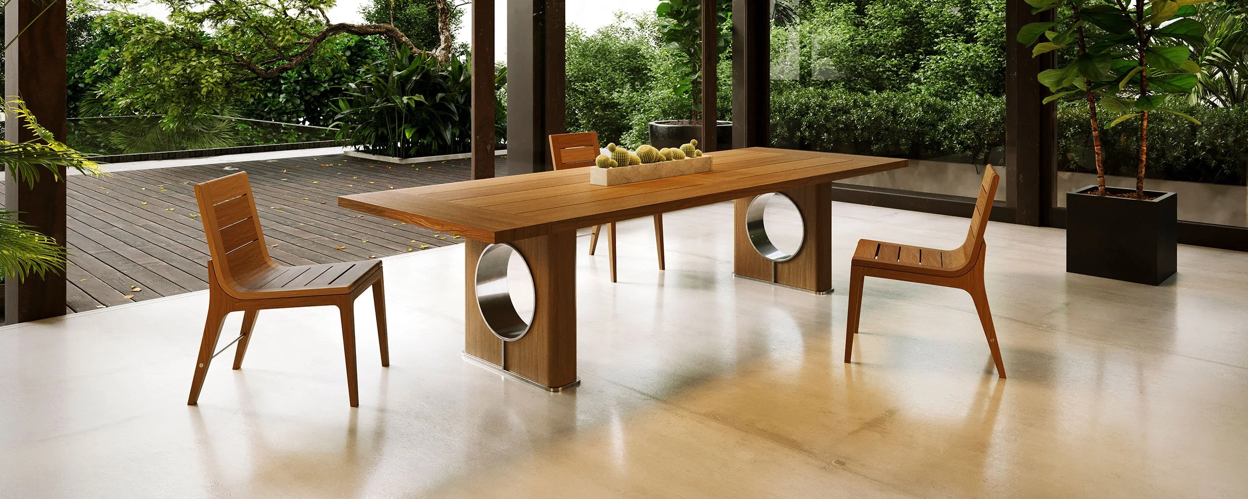 Whether dining al fresco with a small group of friends or hosting a lavish dinner party, the Eclipse series is designed for social gatherings. Constructed from premium aged teak and mirror polished stain steel the Eclipse Dining Table Series infuses modern design with a touch of nautical style that is durable and easy-to-maintain.